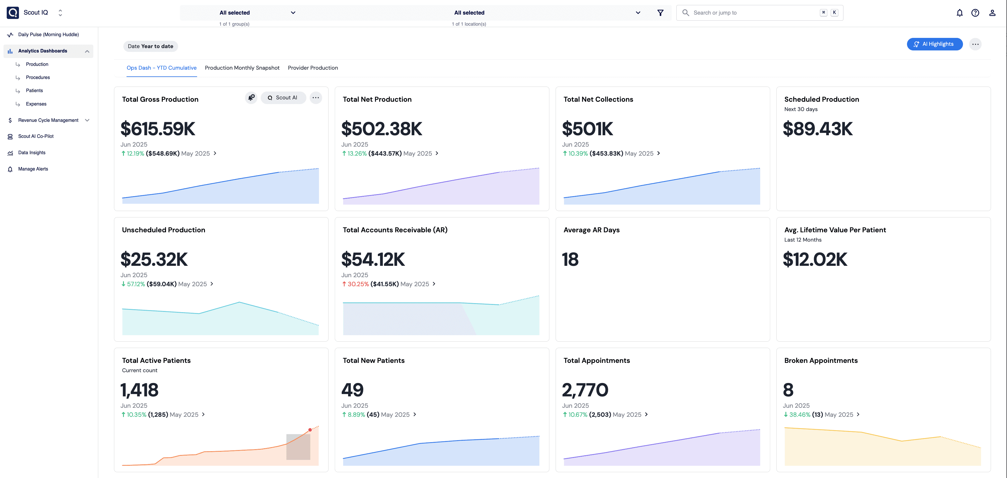 ScoutIQ connects to all your PMS systems automatically. One unified dashboard shows production, collections, A/R, and writeoffs across locations. The AI flags issues in real-time: “location 3 has $12k in 90-day balances.”